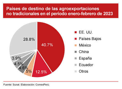En cuanto a los principales países de destino de las agroexportaciones no tradicionales, a febrero de 2023, EE. UU. lidera la lista, con un valor de US$ 647 millones y un incremento del 19.4%. Le siguen Países Bajos (US$ 199 millones, +6.6%), México (US$ 78.6 millones, +53.6%) y China (US$ 73.1 millones, +11.3%). Además, estos cuatro países concentran el 62.8% del total de nuestras exportaciones del rubro al mundo.