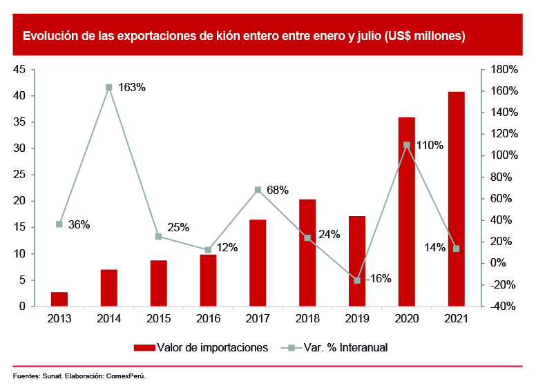 Un producto de agroexportación importante por su evolución es el jengibre (también conocido como kión). Si bien solo representó un 1% de las agroexportaciones no tradicionales entre enero y julio del presente año, sus envíos al mundo registraron un crecimiento del 14% con respecto al mismo periodo del año anterior. Además, cabe resaltar que las exportaciones de jengibre en el periodo 2013-2021 registraron un crecimiento promedio anual del 49%, según cifras de la Sunat.
