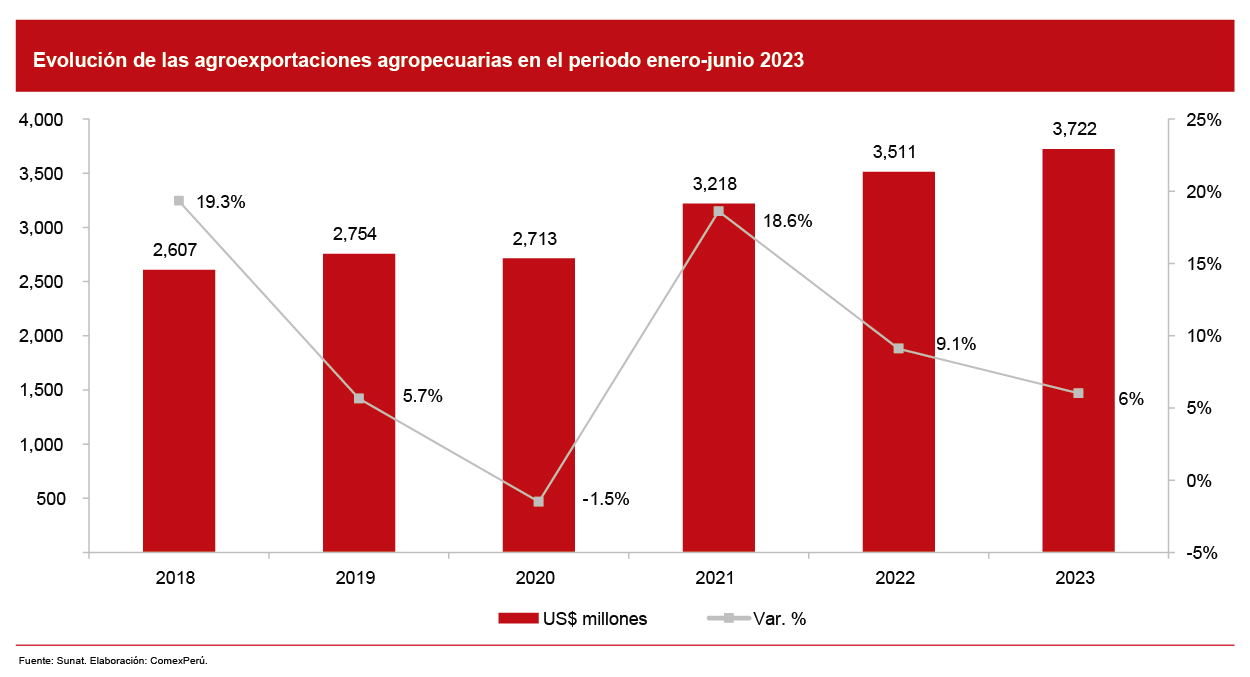 Al respecto, según datos de la Sunat, durante el periodo enero-junio de 2023, las exportaciones no tradicionales del sector agropecuario, el más importante en el caso del Perú, ascendieron a US$ 3,722 millones, lo que evidencia un crecimiento del 6% con respecto al mismo periodo de 2022, cuando sumaron US$ 3,511 millones.