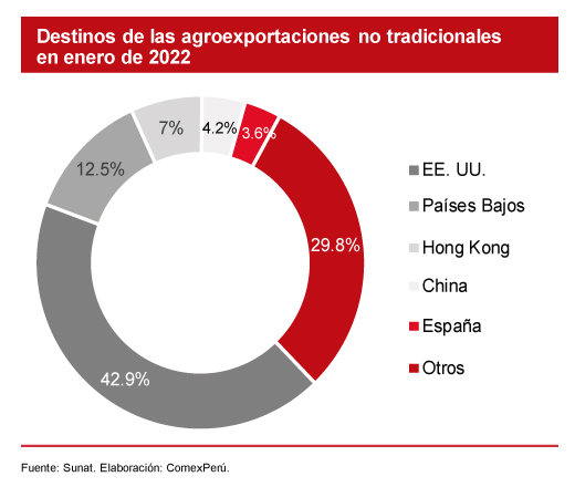 Según cifras de la Sunat, en el primer mes de 2022, las agroexportaciones no tradicionales alcanzaron un valor de US$ 801 millones, lo que representó un crecimiento del 8.6% con respecto al mismo mes de 2021. El principal destino fue EE. UU., con US$ 344 millones, seguido por Países Bajos (US$ 100 millones), Hong Kong (US$ 56 millones), China (US$ 34 millones) y España (US$ 29 millones).