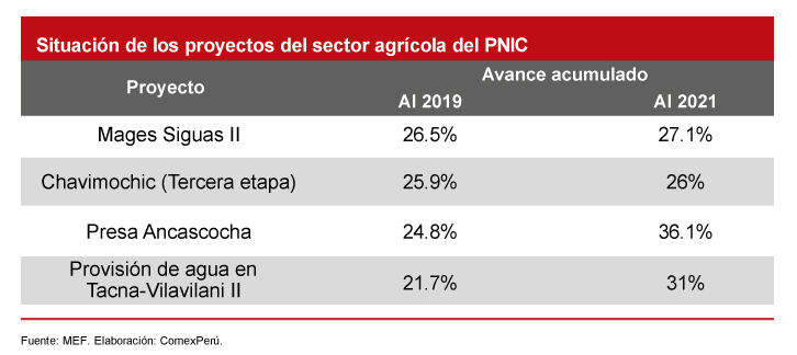 Como detallamos en el sexto Reporte de avances de proyectos del PNIC, los cuatro proyectos priorizados del sector agricultura se encuentran paralizados. En el caso de los proyectos Mejoramiento y ampliación de la provisión de agua para desarrollo agrícola en el valle de Tacna-Vilavilani II y Ampliación de la presa Ancascocha y afianzamiento del valle de Yauca, estos presentan un avance acumulado del 31% y el 36.1%, respectivamente, según el Ministerio de Economía y Finanzas (MEF).