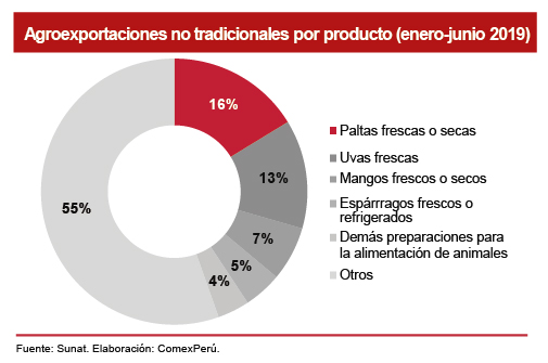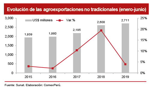 De acuerdo con cifras de la Sunat, en el primer semestre del año, las agroexportaciones no tradicionales sumaron un total de US$ 2,711 millones, lo que significó un incremento del 4% con respecto al mismo periodo del año anterior. Si bien la evolución de este sector mantiene una tendencia positiva en los últimos 5 años, el crecimiento alcanzado este año estuvo por debajo del registrado para el mismo periodo de 2018 (+19.4%).