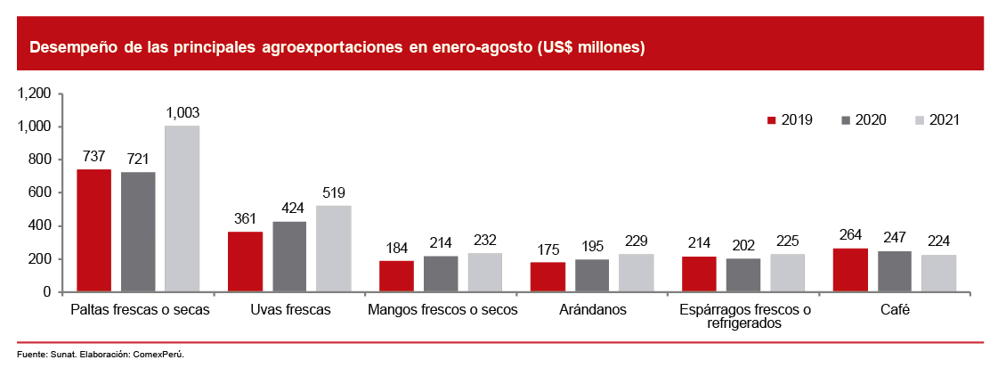 Es importante considerar que estas seis partidas concentraron el 50.3% de nuestras agroexportaciones durante el periodo enero-agosto 2021, participación similar a la registrada durante el mismo periodo de 2020 (48.5%) y 2019 (46.6%). Por ello, para continuar aprovechando los beneficios del libre comercio, será necesario contemplar mecanismos para incrementar la productividad y la competitividad de nuestros principales productos. Esto, sobre todo, al considerar la enorme capacidad de desarrollo que mantienen, pues en los últimos años varios de estos han conquistado el mercado mundial.