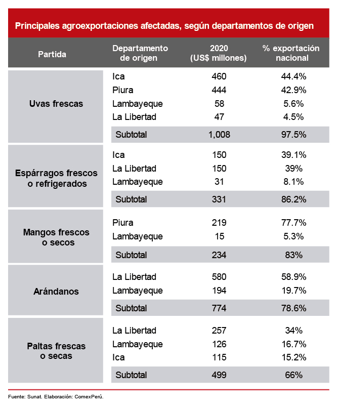 Debido a ello, las exportaciones más afectadas por las modificaciones al Régimen Laboral Agrario serían las de uvas frescas, pues los departamentos de Ica, Piura, Lambayeque y La Libertad exportaron, en conjunto, US$ 1,008 millones el año pasado, un 97.5% del total exportado a nacional. El segundo producto más afectado serían los espárragos frescos o refrigerados (un 86.2% de los envíos nacionales se concentraron en los departamentos más perjudicados), seguidos por los mangos frescos o secos (83%), los arándanos (78.6%) y las paltas frescas o secas (66%).