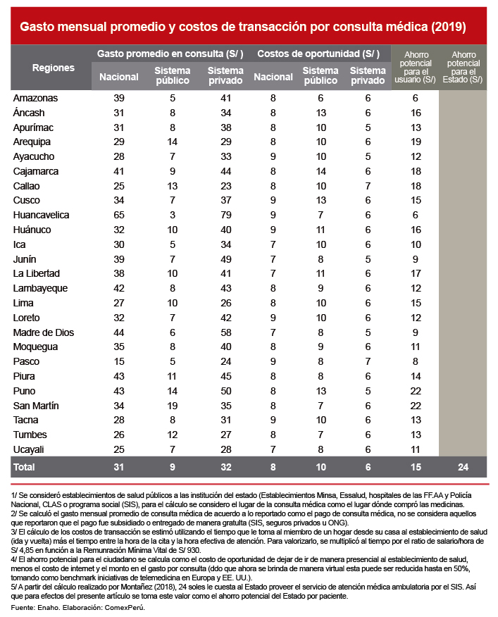 Si bien es cierto que el sistema de salud peruano padece varios problemas, el uso de la telemedicina significa una ventana para reducir tanto los costos enfrentados por los pacientes como los costos e inversiones del Estado, y una oportunidad para redistribuir incluso recursos médicos clave. Para los ciudadanos, la telemedicina representa una oportunidad para ahorrar hasta S/ 15 en centros de salud públicos. A partir de estimaciones hechas con cifras de la Enaho 2019, estos ahorros provendrían de evitar S/ 6 en el costo de trasporte, S/ 4 por tiempo de espera y hasta una reducción del precio de la atención de S/ 5.