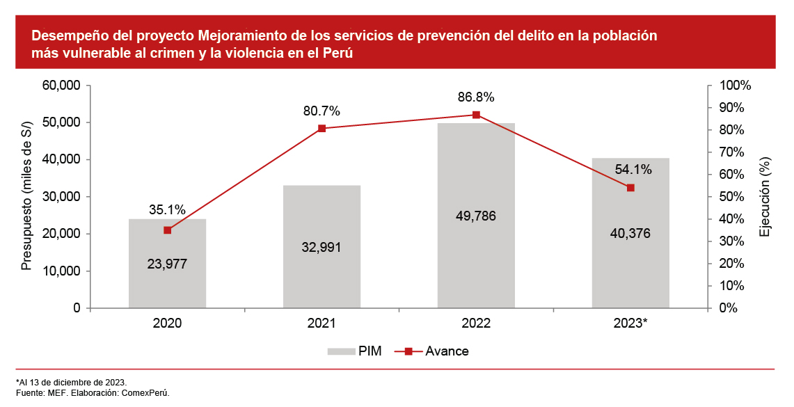 En los últimos años, el proyecto logró que la Escuela de Formación Continua de la Policía Nacional del Perú (PNP) cuente con equipos informáticos, se implementen computadoras en las Escuelas Superiores Técnicos Profesionales de la PNP, se complete la adquisición de drones para las fuerzas policiales y que los efectivos de la Dirección de Inteligencia de la PNP (DIRIN PNP) puedan realizar pasantías en el Cuartel General del FBI. Sin embargo, en materia de ejecución presupuestal, el proyecto tuvo complicaciones en su arranque en 2020, debido a la crisis sanitaria y, en lo que va de 2023, solo se ha ejecutado alrededor de la mitad del presupuesto asignado.