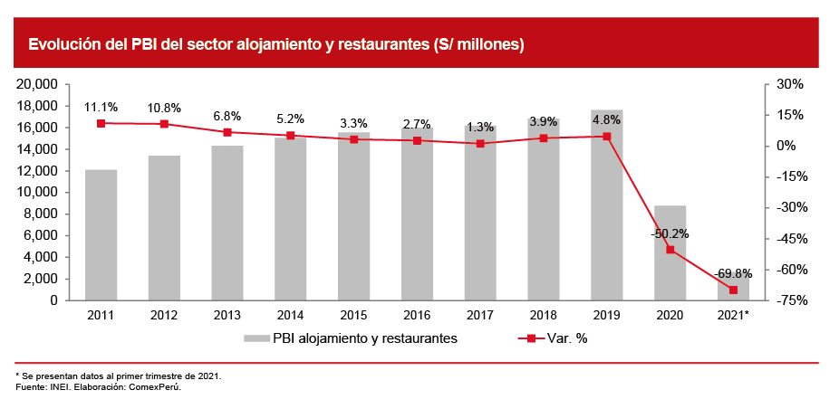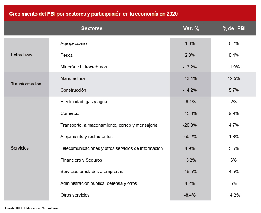 De acuerdo con el boletín de producción nacional, publicado por el Instituto Nacional de Estadística e Informática (INEI), ciertamente, los sectores de la economía que fueron más golpeados por la crisis fueron alojamiento y restaurantes —fuertemente asociado al turismo—, y transportes, los cuales retrocedieron un 50.2% y un 26.8%, respectivamente. Entre otros sectores afectados por la pandemia y que cuentan con una mayor participación en el PBI nacional, se encuentran la manufactura y la minería e hidrocarburos, los cuales cayeron un 13.4% y un 13.2%, y tuvieron una participación del 12.5% y el 11.9% en el PBI de 2020, respectivamente.