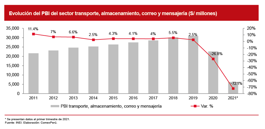 Por su lado, las actividades derivadas del sector transporte, almacenamiento, correo y mensajería permitieron que este obtuviera un PBI de S/ 30,887 millones en 2019, el cual creció sin interrupción, en promedio, un 5.3% en el periodo 2010-2019. Si bien, en ese último año, el PBI del sector contribuyó a la economía nacional con un 5.7%, cayó abruptamente a S/ 22,605 millones en 2020, como consecuencia de la menor actividad. Cabe recalcar que, en el primer trimestre de 2021, el PBI del sector alcanzó un valor de S/ 6,300 millones y para que vuelva a despegar es necesario enfocar las propuestas del Estado en dinamizar sus principales componentes: transporte por vía aérea; transporte por vía terrestre y por tubería, y transporte por vía acuática.