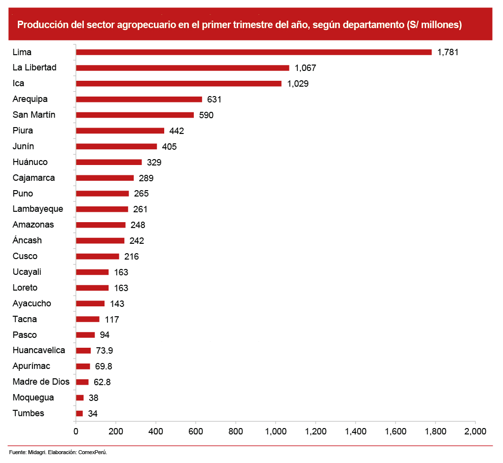 A nivel departamental, Lima lideró la producción agropecuaria, la cual registró un valor de S/ 1,781 millones en el primer trimestre de 2023, un 0.6% más respecto del mismo período de 2022, de acuerdo con cifras del Midagri. Le siguen La Libertad (S/ 1,067 millones, +3.9%), Ica (S/ 1,029 millones, +4.9%), Arequipa (S/ 631 millones, -7.3%) y San Martín (S/ 590 millones, +4.3%), los cuales representan una participación conjunta del 58.2% sobre el total de la producción agropecuaria.