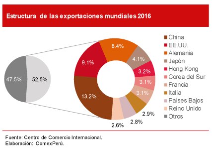 Actualmente, China abarca un 13.2% de las exportaciones mundiales y es que, a lo largo de los últimos años, ha venido desarrollando ventajas comparativas que lo posicionan como líder en envíos de mercancías al mundo. Entre sus principales productos se encuentran maquinaria eléctrica, mueblería, textiles y materias primas como aluminio y acero. A pesar de tales ventajas, existen actores políticos y comerciales en diversos países del mundo, incluido el nuestro, que acusan a este país de ejercer una competencia desleal, con el afán de proteger la industria nacional, en lugar de enfocarse en desarrollar sus propias ventajas comparativas para añadirle mayor valor a la producción de bienes y así competir en el mercado internacional. Asimismo, resulta relevante destacar que EE.UU., a pesar de las constantes quejas por su déficit comercial, fue el segundo mayor exportador del mundo, con un 9.1% de los envíos totales en 2016.