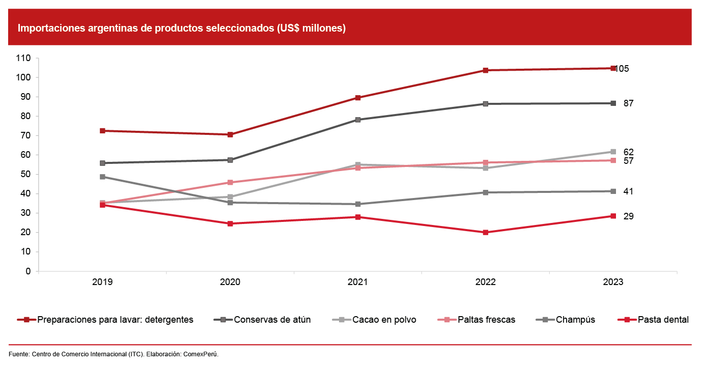 De acuerdo con el Centro de Comercio Internacional (ITC, por sus siglas en inglés), las importaciones argentinas de naranjas frescas alcanzaron un valor de US$ 2.9 millones en 2023, lo que significó un crecimiento del 104% con respecto a 2022, mientras que las conservas de atún sumaron US$ 86.7 millones, con un ligero aumento del 0.3%. En el caso de las preparaciones para lavar, como el detergente, Argentina registró compras por un valor de US$ 105 millones, lo que evidenció un crecimiento del 1%. Los productos de aseo, como los champús y las pastas dentales sumaron US$ 41.3 millones (+1.5%) y US$ 28.5 millones (+42.1%), respectivamente.