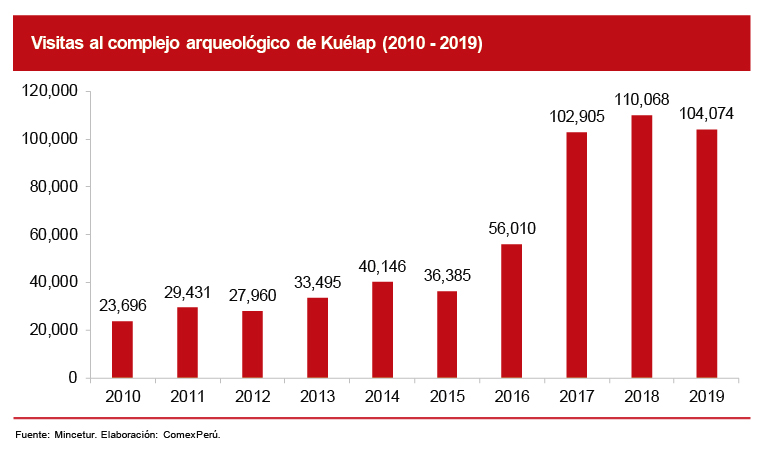 Además de incrementar el número de visitantes al complejo arqueológico de Kuélap, es importante destacar el impacto potencial indirecto sobre otros atractivos turísticos de la región Amazonas. Así, las cataratas de Gocta pasaron de recibir 26,256 visitantes en 2016 a 59,531 en 2019 (+126.7%). De igual manera, el museo de Leymebamba pasó de 14,293 visitantes en 2016 a 18,673 en 2019 (+30.6%). Por su parte, la caverna de Quiocta pasó de 5,695 visitantes en 2016 a 9,677 en 2019 (+69.9%).