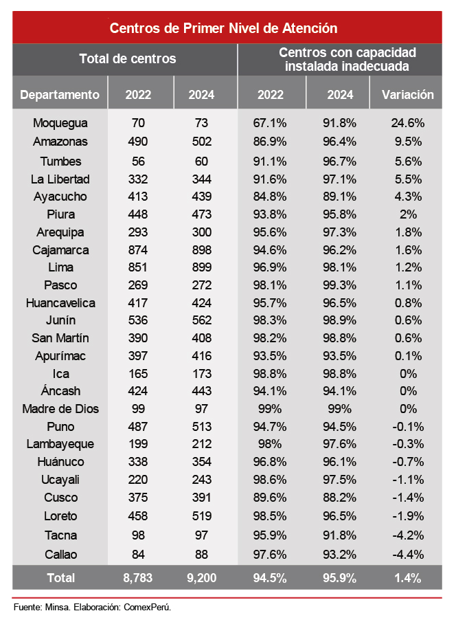 En agosto de 2025, el Ministerio de Salud (Minsa) publicó la actualización del Diagnóstico de Brechas de Infraestructura o Acceso a Servicios del Sector Salud de cara a la elaboración de la Programación Multianual Inversiones para el período 2027-2029. En el informe se observan avances en la construcción de hospitales y centros de atención, aunque persisten retos para cubrir a toda la población, así como de dotar a los establecimientos ya existentes de capacidad adecuada para contribuir a que su impacto sea efectivo.