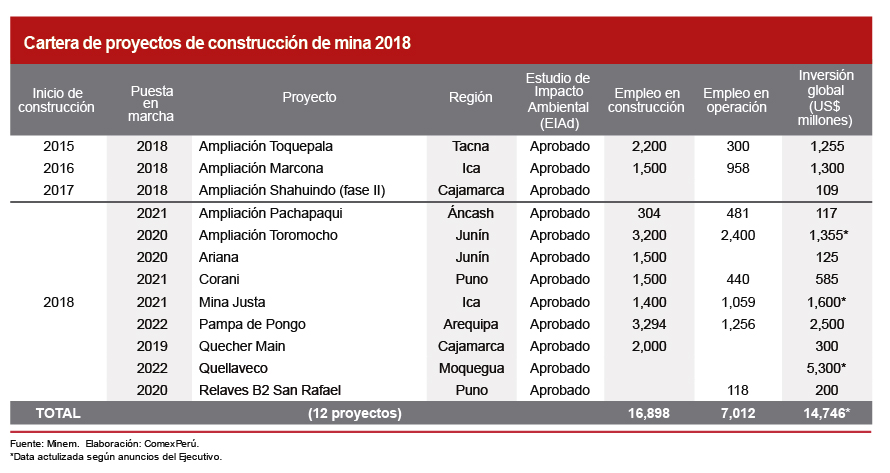 De acuerdo con el Minem, tres proyectos terminarían su etapa de construcción de mina este año, y se prevé el inicio de nueve más. Estos doce proyectos, en conjunto, representarían una inversión de US$ 14,746 millones, que se ejecutarían durante los años 2018-2022. De los que terminarían su construcción este año, la ampliación de la mina de Marcona en Ica es el más importante por el monto invertido, con un total de US$ 1,300 millones. Dicho proyecto generaría 1,500 empleos de construcción y 958 de operación. Esto permitiría que la producción anual de hierro de la mina aumente en 6.5 millones de TMF.