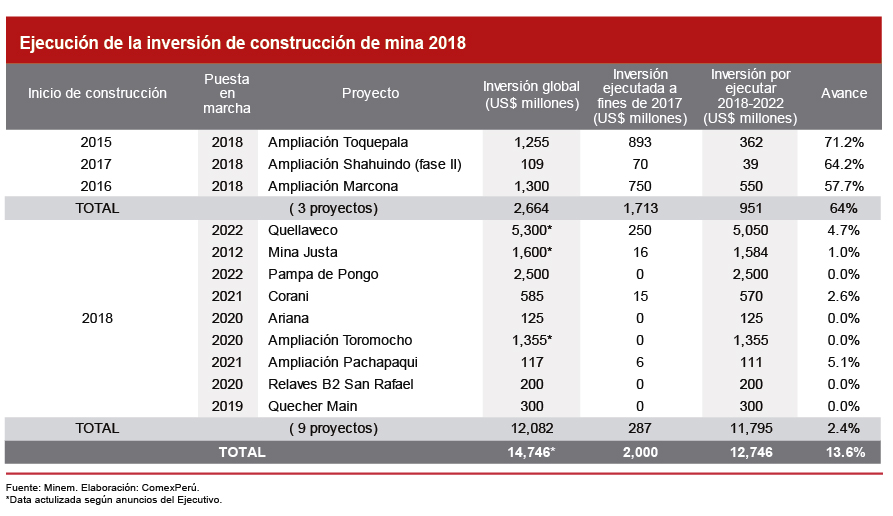 Según el Ministerio de Energía y Minas (Minem), la cartera de proyectos de construcción de mina de 2018 posee 49 proyectos, con un monto de inversión total de US$ 58,507 millones, para ser ejecutados entre 2018 y 2027, de los cuales, hasta fines de 2017, se ejecutaron US$ 3,850 millones (6.6% del total). De acuerdo con Roque Benavides, presidente de la Confiep, el sector minero es un motor de la economía peruana por el flujo de dinero que genera mediante la inversión privada, el impuesto a la renta (IR), canon, regalías, aranceles, etc. Por ello, es importante agilizar la ejecución de su inversión, lo que le permitirá operar y, también, generar las condiciones para atraer más inversión hacia nuestro país.