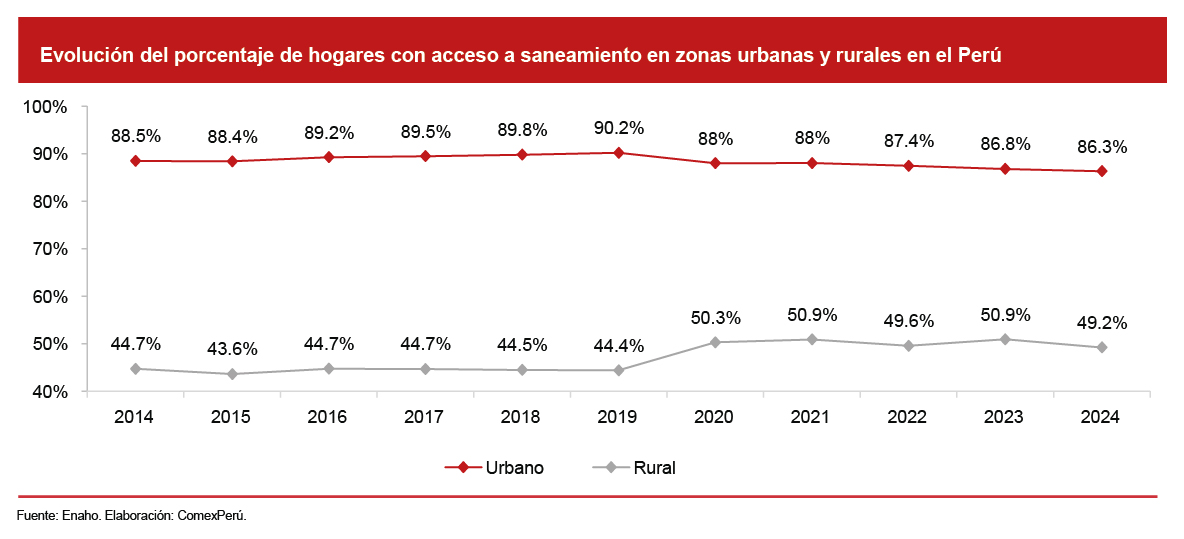 En 2024, el 91.6% de los hogares en zonas urbanas accedió al agua potable, frente al 76.1% en zona rural; mientras que el saneamiento alcanzó al 86.3% de los hogares urbanos, pero solo al 49.2% de los rurales, según estimaciones hechas a partir de la Encuesta Nacional de Hogares (Enaho). Además, en el ámbito urbano se observa una ligera reducción en los últimos años influida, en parte, por el crecimiento poblacional de las ciudades. Asegurar una gestión integral de proyectos para el acceso a agua y saneamiento, que acompañe el crecimiento urbano, resulta importante para garantizar servicios sostenibles, reducir vulnerabilidades y mejorar la calidad de vida de la población.