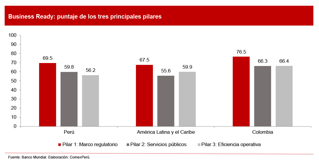 El Perú superó el promedio de América Latina y el Caribe en el pilar de marco regulatorio, con una ventaja de 2 puntos, y en el de servicios públicos, con 4.2 puntos. Sin embargo, obtuvo un puntaje inferior al promedio regional en el pilar de eficiencia operativa.