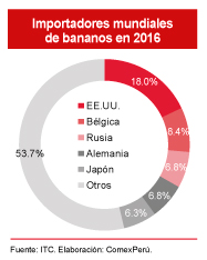 De esta manera, resulta interesante analizar el mercado potencial que posee el Perú al hablar de los bananos. Según el ITC, en 2016, las importaciones mundiales alcanzaron un valor de US$ 14,635 millones, de los cuales EE.UU. compró US$ 2,630 millones (18% del total); Bélgica, US$ 1,230 millones (8.4%), y Rusia, US$ 999 millones (6.8%). Por otro lado, según la Organización de las Naciones Unidas para la Alimentación y la Agricultura (FAO, por sus siglas en inglés), la producción de bananos y plátanos en el Perú, en 2016, representó un 0.27% de la producción mundial, mientras que la de Ecuador representó un 5.2%.