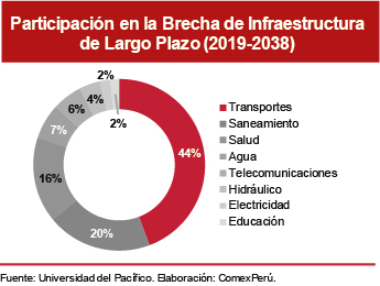 En cuanto a la brecha de infraestructura de acceso básico de largo plazo (20 años), es necesaria una inversión de S/ 363,452 millones para alcanzar el nivel de países desarrollados, como los miembros de la OCDE, y de nuestros pares de la Alianza del Pacífico. Dentro de esta brecha, el 44% se concentra en el sector transportes, seguido por saneamiento (20%), salud (26%) y agua (7%).