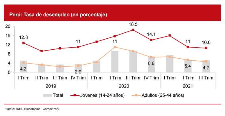 El Perú no ha sido ajeno a esta situación. En 2020, el empleo se contrajo un 13% con respecto a 2019, lo cual significó una pérdida de 2.23 millones de puestos de trabajo, de acuerdo con el Informe anual de desempeño del mercado laboral peruano elaborado por ComexPerú. Según cifras del Instituto Nacional de Estadísticas e Informática (INEI), con el grupo de jóvenes, población entre 14 y 24 años, alcanzó una tasa de desempleo máxima del 18.5% en 2020, en contraste con el grupo de adultos que alcanzó un 11%. Para el tercer trimestre de 2021, como se puede observar en el gráfico, hay una ligera recuperación para los dos grupos etarios; no obstante, aún existe una notoria brecha en la tasa de desempleo entre el grupo de jóvenes (10.6%) y adultos (4.7%).