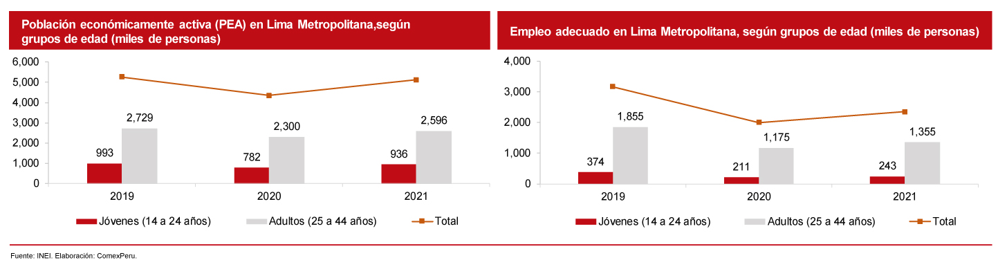 A pesar del aumento de la PEA en la población joven en 2021, esta solo representó un 18.9% (936,000 personas) del total, mientras que los adultos representaron el 50.8% (2,596 miles de personas). Cabe mencionar que aún no se superan los niveles previos a la pandemia.