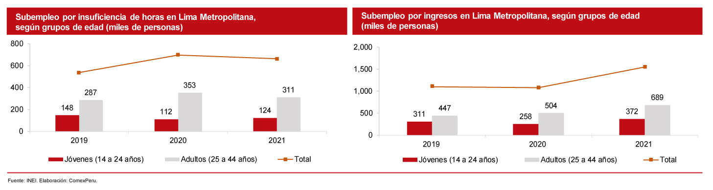 La población adulta subempleada por ingresos se incrementó un 54,1% y la población joven, un 44% con respecto a 2020. Asimismo, los jóvenes y adultos representaron el 24% (372,000 personas) y el 44.6% (689,000 personas), respectivamente.