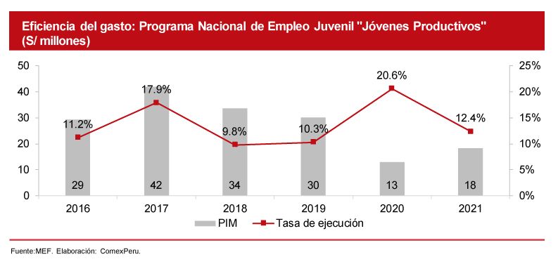 De acuerdo con el Ministerio de Economía y Finanzas, en 2021, este programa recibió un presupuesto de S/ 18 millones, un 40.9% más que en 2020 (S/ 13 millones), pero un 38.8% menos que en 2019 (S/ 30 millones). No obstante, la tasa de ejecución ha sido del 12.4%, es decir, 8 puntos porcentuales menos que en 2020 (20.6%). Estas cifras son bastantes desalentadoras, puesto que, a pesar de los grandes problemas que enfrenta el mercado laboral juvenil, la ejecución en este tipo de programas no ha superado el 20% en todos estos años.