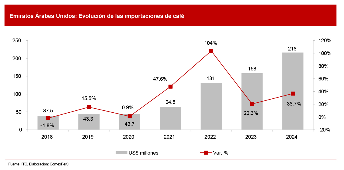 En 2024, Emiratos Árabes Unidos importó café verde por US$ 216 millones, con un volumen de 47,512 toneladas a un precio promedio de US$ 4.6/kg, según cifras del ITC. El café peruano ingresó a un precio superior de US$ 5.3/kg. Además, entre 2022 y 2024, sus compras externas registraron un crecimiento promedio anual del 28.2%. Brasil y India se posicionaron como los principales proveedores al concentrar el 65% de las importaciones. Por su parte, en 2024, los envíos peruanos sumaron 145 toneladas, lo que representó un 0.4% de las importaciones. Además, Emiratos Árabes Unidos se ha consolidado como un hub logístico y de reexportación de café en la región del Golfo.
