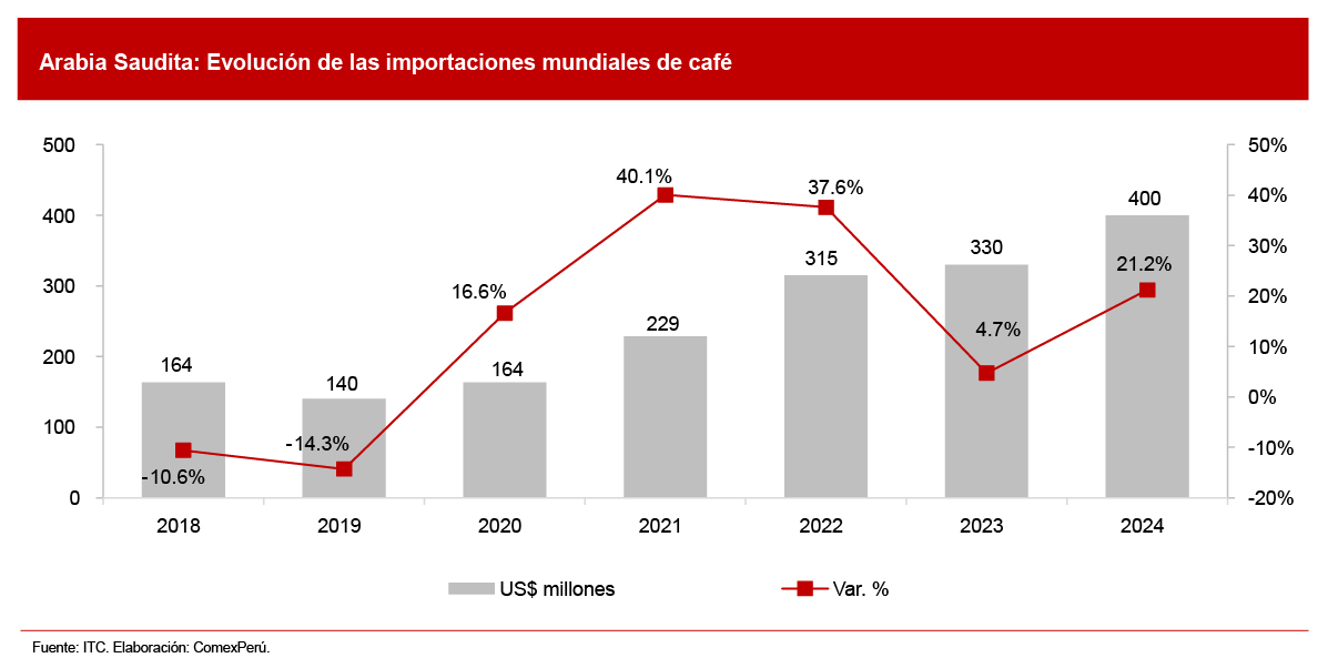 Con respecto a Arabia Saudita, el país árabe importó café verde por US$ 400 millones en 2024, con un volumen de 83,597 toneladas y a un precio promedio de US$ 4.8/kg. El café peruano ingresó a US$ 8.3/kg, Entre 2022 y 2024, sus compras externas registraron un crecimiento promedio anual del 12.7%. Etiopía se posicionó como el principal proveedor al concentrar el 67% de las importaciones. En el caso del Perú, los envíos sumaron 253 toneladas en 2024, lo que representó un 0.5% de las importaciones de dicho país.