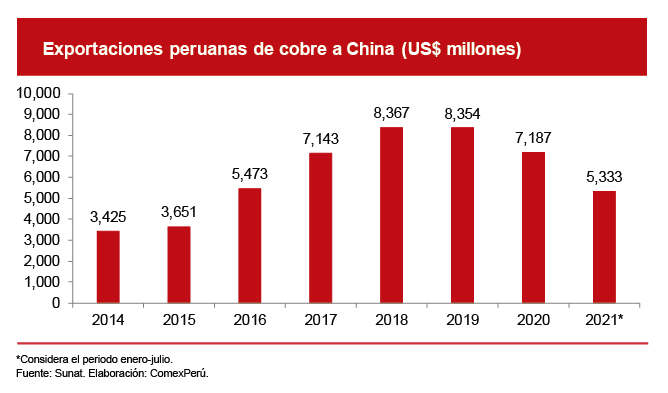 En el caso peruano, las exportaciones de minerales de cobre y sus refinados a China tuvieron un valor de US$ 8,354 millones (el 68.2% del total) en 2019, por lo que constituyó nuestro el principal destino de exportación de este producto. Esto se mantuvo en 2020, ya que, a pesar de los efectos de la pandemia, la exportación cuprífera fue de US$ 7,189 millones (64.7%), y en lo que va de 2021 suma un total de US$ 5,333 millones (70.4%).