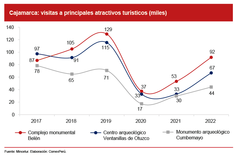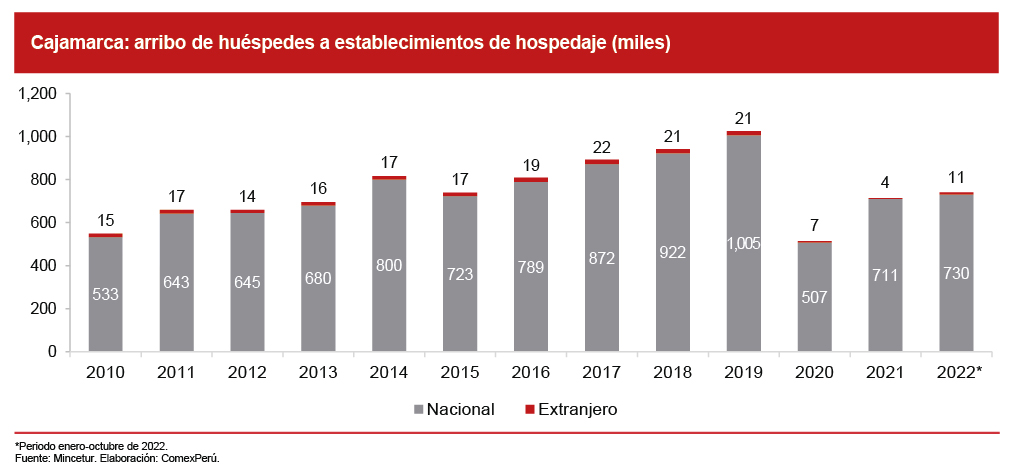 De acuerdo con información del Mincetur, en 2022, Cajamarca fue el 13.er departamento más visitado a nivel nacional. Antes de la pandemia, el número de arribos a hospedajes cajamarquinos marcó un récord y superó el millón (1,025,993). Sin embargo, tras caer a más de la mitad en 2020, el turismo, medido a través de este indicador, aún no se logra recuperar. Así, en 2022, se registró un total de 740,329 arribos, un 28% menos que en 2019.