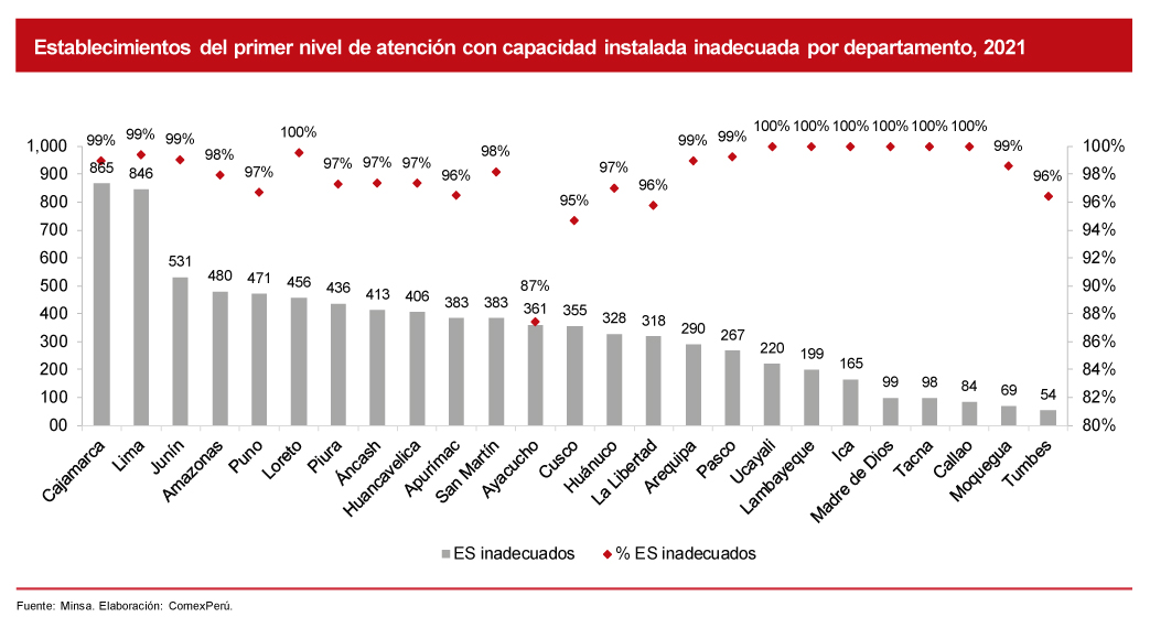 A nivel departamental, el Callao, Ica, Lambayeque, Madre de Dios, Tacna y Ucayali tienen el 100% de sus ES del primer nivel de atención con capacidad instalada inadecuada. Además, Cajamarca y Lima presentan la mayor brecha con mayor cantidad en términos de infraestructura y equipamiento, con un total de 865 y 846 establecimientos de este nivel, respectivamente.