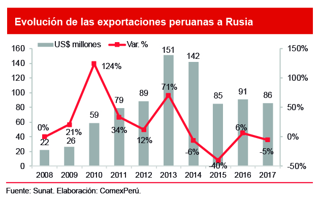 De acuerdo con cifras de la Sunat, en el periodo 2008-2017, las exportaciones peruanas a Rusia crecieron a una tasa promedio anual del 15%, hasta alcanzar un valor de US$ 86 millones en el último año. De ese monto, US$ 81 millones correspondieron a envíos del rubro no tradicional (94% del total) y US$ 5 millones a envíos del rubro tradicional (6%).