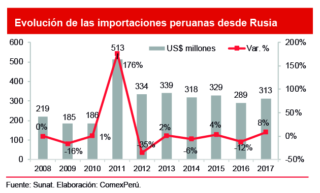 En lo que respecta a nuestras importaciones provenientes de Rusia, estas pasaron de US$ 219 millones en 2008 a US$ 313 millones en 2017, lo que evidencia una tasa de crecimiento promedio anual del 4%. Cabe mencionar que, en el último año, aumentaron un 8% con respecto a 2016, cuando el valor importado fue de US$ 289 millones.