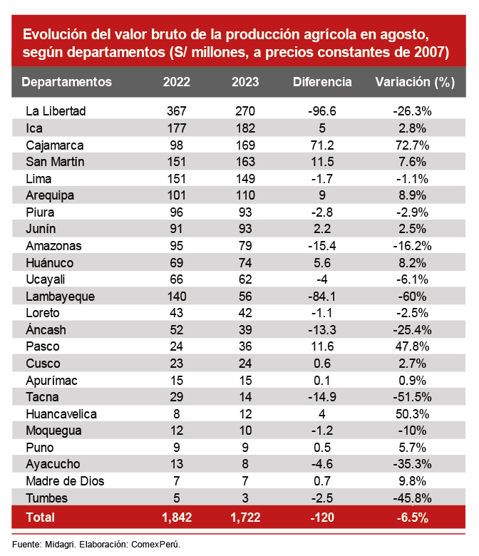 De acuerdo con estimaciones del Ministerio de Desarrollo Agrario y Riego (Midagri), en agosto último, el valor bruto de la producción agropecuaria ascendió a S/ 2,982 millones (a precios constantes de 2007). De este monto, S/ 1,722 millones correspondieron al subsector agrícola, lo que evidenció una caída del 6.5% con respecto al mismo mes del año anterior. El principal determinante de esta reducción sería el menor valor producido en departamentos como La Libertad; donde se perdieron S/ 97 millones con respecto a agosto del año pasado (-26.3%); y Lambayeque (- S/ 84 millones; -60%). A pesar de esto, el crecimiento en Cajamarca, que generó un margen de S/ 71 millones superior a 2022, contribuyó a mitigar esta caída.