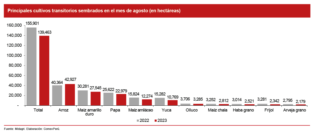 En relación con la superficie asignada para los cultivos transitorios, el principal producto sembrado fue el arroz, con 42,927 hectáreas dedicadas a su plantado en el mes de agosto. Otros cultivos importantes en este mes fueron el maíz amarillo duro, con 27,545 hectáreas, y la papa, con 22,979. Es importante destacar que la caída en las hectáreas sembradas de cultivos transitorios (-10.5%) también se puede explicar por pérdidas importantes en el cultivo de yuca, ya que se dejaron de cultivar 4,513 hectáreas con relación al mismo mes del año anterior (-29.5%). A esto le siguen pérdidas en el cultivo de maíz amiláceo (-3,550 hectáreas; -22%), maíz amarillo duro (-2,736 hectáreas; -9%) y papa (-2,644 hectáreas; -10.3%).