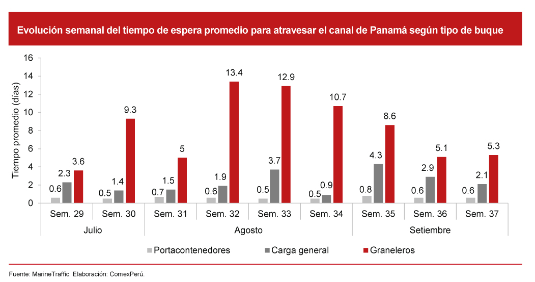 A pesar de ello, la congestión en el canal ha mejorado durante las últimas semanas. El 21 de setiembre último se registraron 104 buques en espera, según cifras de MarineTraffic, plataforma web que brinda información en tiempo real sobre los movimientos y la ubicación de los barcos. Asimismo, existe una mejora significativa con relación a los tiempos de espera, puesto que, durante la segunda quincena de agosto, un buque granelero debía esperar aproximadamente 13 días para cruzar el canal, mientras que al 17 de setiembre el tiempo de espera ascendía a 5 días.