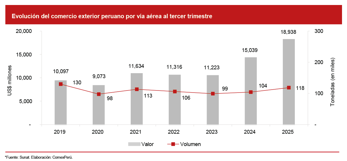 Entre enero y setiembre de 2025, las exportaciones vía aérea sumaron 76,596 TM, lo que significó un crecimiento del 18.9% con respecto al mismo periodo del año anterior.