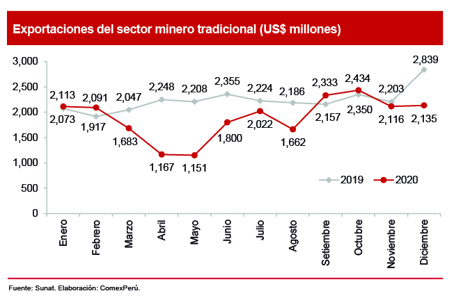 Nuestros envíos al exterior también se incrementaron desde junio, según datos de la Sunat, inclusive superando los niveles de 2019 en setiembre y octubre, si bien lo mismo no ocurrió a fines del año. En total, las exportaciones tradicionales del sector minero tuvieron un valor de US$ 22,705 millones, un 15.3% menos respecto de 2019. Los principales productos exportados fueron los minerales de cobre y concentrados (US$ 9,313 millones, -23.9%), seguidos por el oro en las demás formas en bruto, incluido el oro platinado (US$ 6,436 millones, - 7.7%), y los cátodos y secciones de cátodos de cobre refinado (US$ 1,785 millones, +10.1%). Nuestros tres principales destinos fueron China (US$ 9,632 millones, -17.5%), Canadá (US$ 2,043 millones, +4.8%) y EE. UU. (US$ 1,883 millones, +56%).