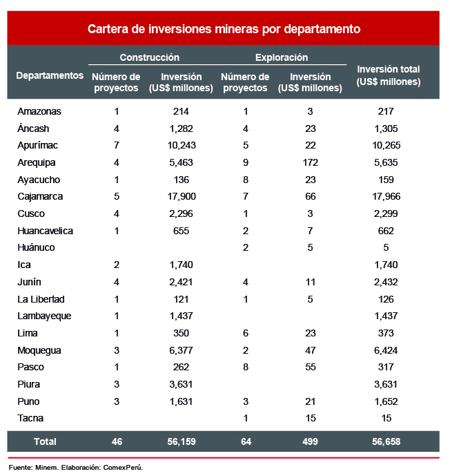 CARTERA DE PROYECTOS MINEROS EQUIVALE A US$ 56,658 MILLONES Y SE DISTRIBUYE EN 19 DEPARTAMENTOS