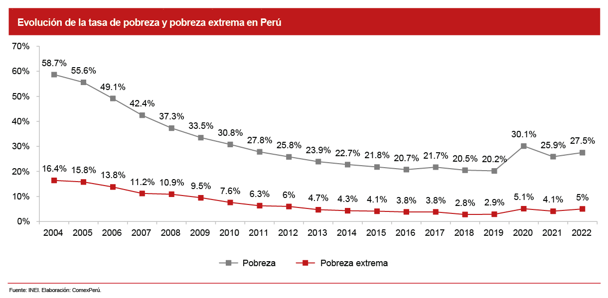Si bien, entre 2004 y 2019, la tasa pobreza se redujo en 38.5 pp., dado un alto crecimiento del PBI per cápita a nivel nacional, según el Banco Central de Reserva del Perú (BCRP), en 2022, el nivel de pobreza se incrementó en 7.3 pp. más que antes de la pandemia, lo que representa a 2.7 millones de personas pobres adicionales respecto de 2019. De acuerdo a un reciente reporte sobre la evaluación de la pobreza en el Perú del Banco Mundial, el crecimiento económico sostenido impulsó un proceso significativo de reducción de la pobreza y desigualdad en los años previos a la pandemia; no obstante, los resultados indicaron lo contrario.