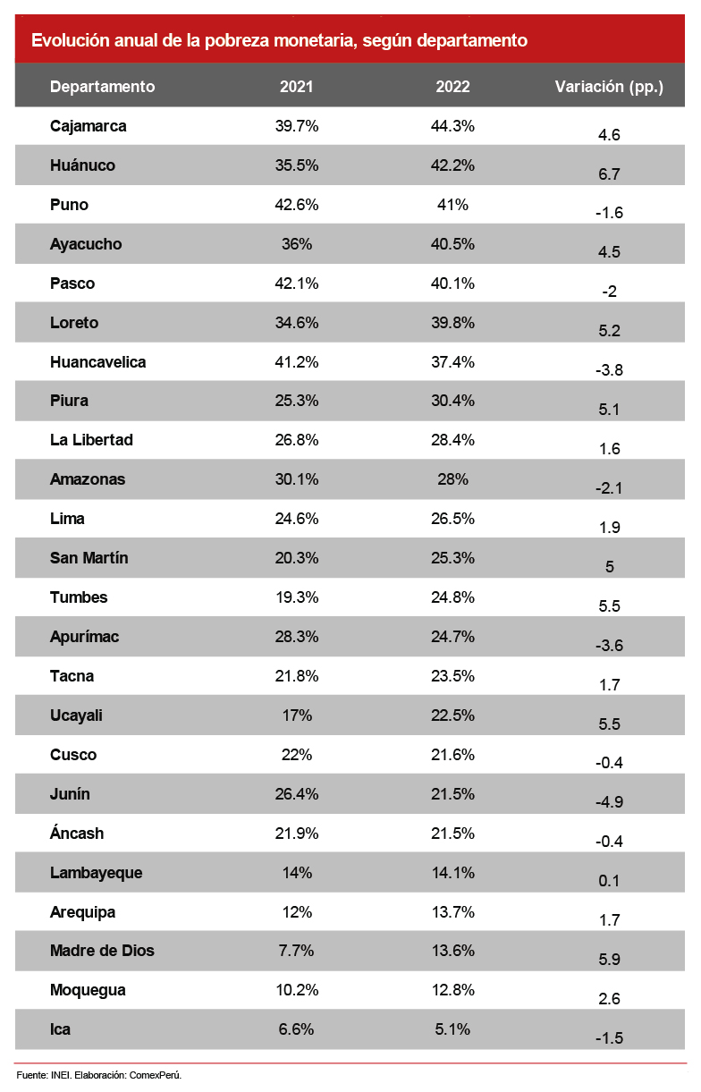 A nivel departamental, Ica (5.1%), Moquegua (12.8%), Madre de Dios (13.6%), Arequipa (13.7%) y Lambayeque fueron los principales departamentos que presentaron una menor incidencia de pobreza en 2022. En contraste, Cajamarca (44.3%), Huánuco (42.3%), Puno (41%), Ayacucho (40.5%) y Pasco (40.1%) obtuvieron los peores resultados, los cuales fueron superiores al 40% en dicho año. Asimismo, Huánuco fue el departamento que tuvo una mayor subida en la tasa de pobreza, con un cambio de 6.7 pp. en comparación con 2021. Por otro lado, Junín mostró una mayor caída de 4.9 pp., a pesar de tener una tasa del 21.5%. Le sigue Lima, que registró un nivel del 26.5%, con un aumento de 1.9 pp.