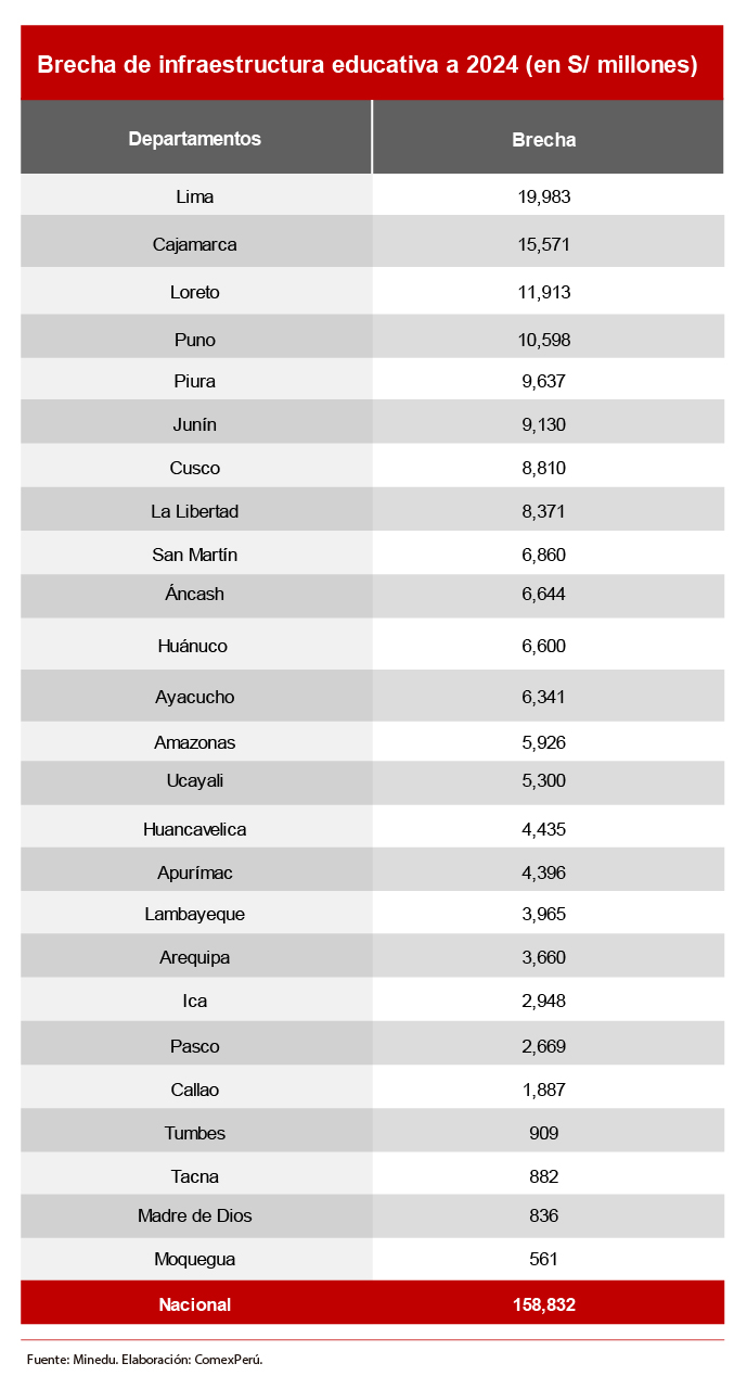 Hasta el año previo, la brecha de infraestructura educativa estimada para colegios ascendió a S/ 158,832 millones, según el Ministerio de Educación (Minedu). Esto significa que se requiere invertir esa cantidad de dinero para cubrir las deficiencias y necesidades en la construcción, mantenimiento y equipamiento de locales educativos, así como el acceso a servicios básicos de agua potable, electricidad y saneamiento. Un 62.6% del total corresponde a instituciones educativas en zonas rurales, mientras que un 37.4% pertenece a colegios de áreas urbanas. Los departamentos que mayor inversión requieren son Lima (S/ 19,983 millones), Cajamarca (S/ 15,571 millones) y Loreto (S/ 11,913 millones).