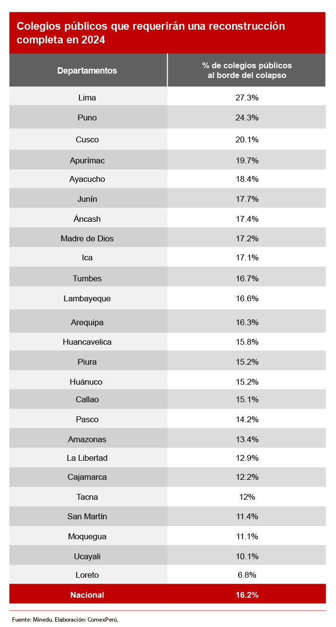 A diciembre de 2024, la infraestructura educativa en el país presentaba una brecha de S/ 158,832 millones. A nivel nacional, el 16.2% de los colegios se encontraba al borde del colapso, y son Lima, Puno y Cusco los departamentos con los mayores porcentajes de instituciones en condiciones críticas.