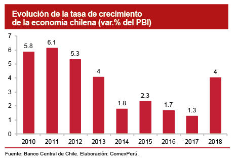 Ahora bien, tras cuatro años de estancamiento, en 2018, la economía chilena creció un 4%, tasa por encima del promedio mundial (+3.6%) y regional (+1%). Dicho resultado estuvo impulsado por una mayor confianza del sector privado y una normalización de las tasas de interés, que contribuyeron al repunte de la demanda interna, reflejada en un mayor consumo y, principalmente, en un mayor dinamismo de la inversión.