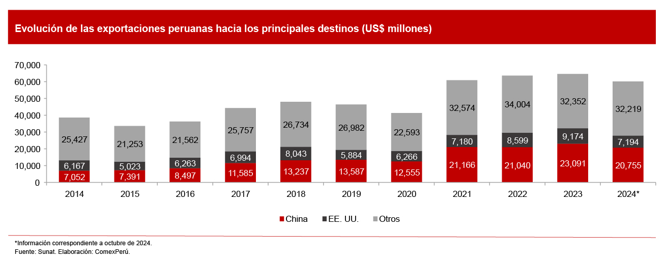 Al ser China el mayor comprador de productos peruanos en la última década, su menor crecimiento tendría consecuencias para nuestras exportaciones. A octubre de 2024, un 34.5% de los envíos al exterior tenían como destino al gigante asiático.