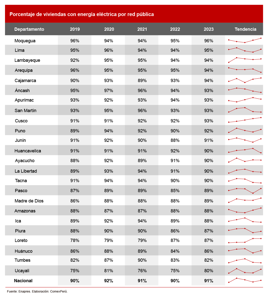En 2023, 5 de 24 departamentos tenían un porcentaje de viviendas con acceso a energía eléctrica inferior a su nivel de prepandemia. Los departamentos con menor porcentaje de cobertura fueron Huánuco, Tumbes y Ucayali.