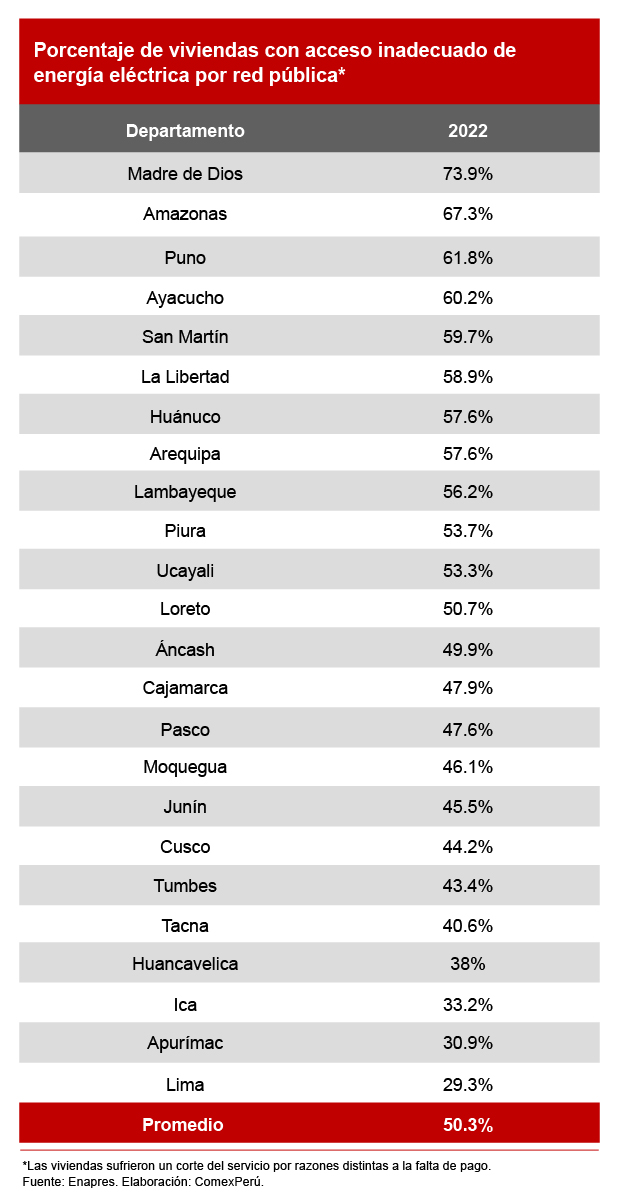 En ese mismo año, un 50.3% de las viviendas a nivel nacional tenían un acceso inadecuado al servicio de energía eléctrica debido a interrupciones no relacionadas con deudas. Se observa que 12 de los 24 departamentos del país tenían más del 50% de viviendas con acceso deficiente a la energía eléctrica por red pública. Madre de Dios tuvo el porcentaje más alto, con un 73.9%, seguido por Amazonas, con un 67.3%, y Puno, con un 61.8%.
