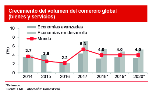 El Fondo Monetario Internacional (FMI), en su reciente publicación World Economic Outlook Update, redujo sus proyecciones para el desempeño de la economía global para 2019 y 2020, las que también fueron revisadas a la baja en su publicación de octubre último. Las crecientes tensiones comerciales y condiciones financieras más ajustadas, así como una consecuente incertidumbre respecto de las políticas que se adoptarían, afectarían no solo al producto, sino también a la inversión y el comercio global. Así, el crecimiento del volumen del comercio global de bienes y servicios no solo se habría desacelerado en 2018, al pasar del 5.3% en 2017 al 4%, sino que se mantendría en este nivel en los próximos dos años. Este “estancamiento” —con menores tasas que las registradas en 2017, tanto para las economías en desarrollo como las avanzadas— aunado a factores de riesgo para la economía mundial, podría debilitar las cadenas globales y mermar la competitividad global.