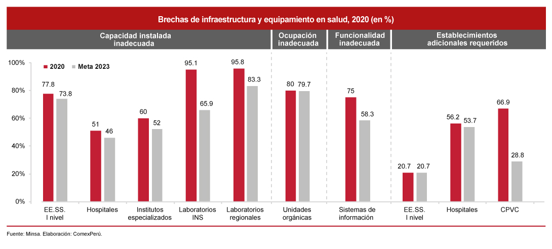 En cuanto a los institutos especializados, el 60% de ellos no cuenta con infraestructura y equipamiento acordes con los estándares sectoriales establecidos, por lo que su servicio se ve limitado. Si bien en los últimos años hubo una fuerte inversión en el Instituto Nacional Cardiovascular (Incor) y el Instituto Nacional de Salud del Niño San Borja, entre otros, aún se requieren mayores fondos para fortalecer otros establecimientos dependientes de los Gobiernos regionales y el Minsa.